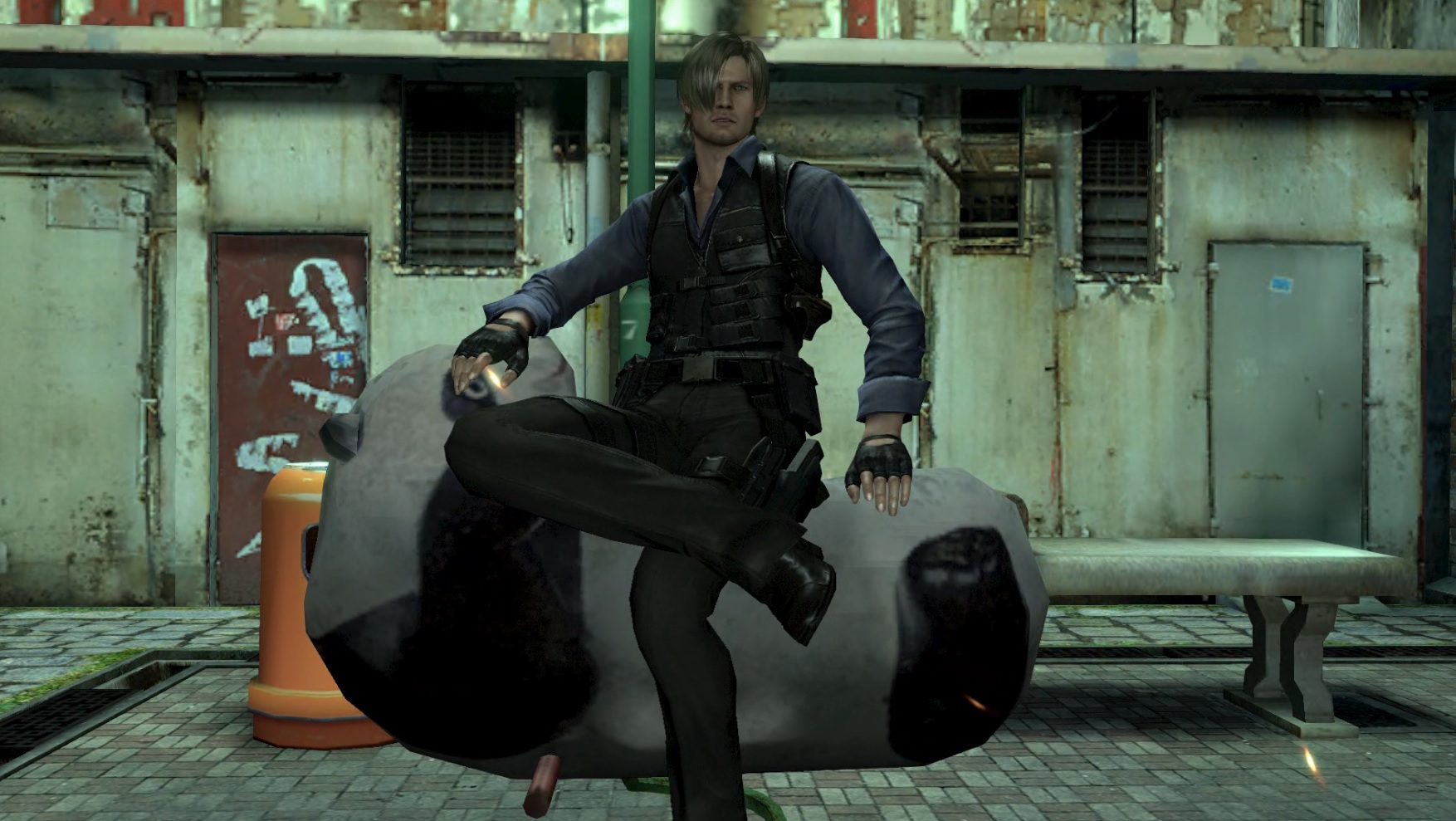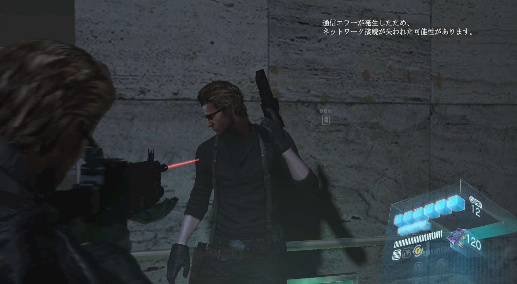 レオン、ピアキャノンを撃つ(若干腰が引けてる、ていうか、クリスに当たってる