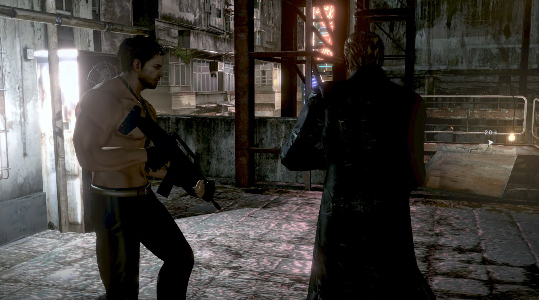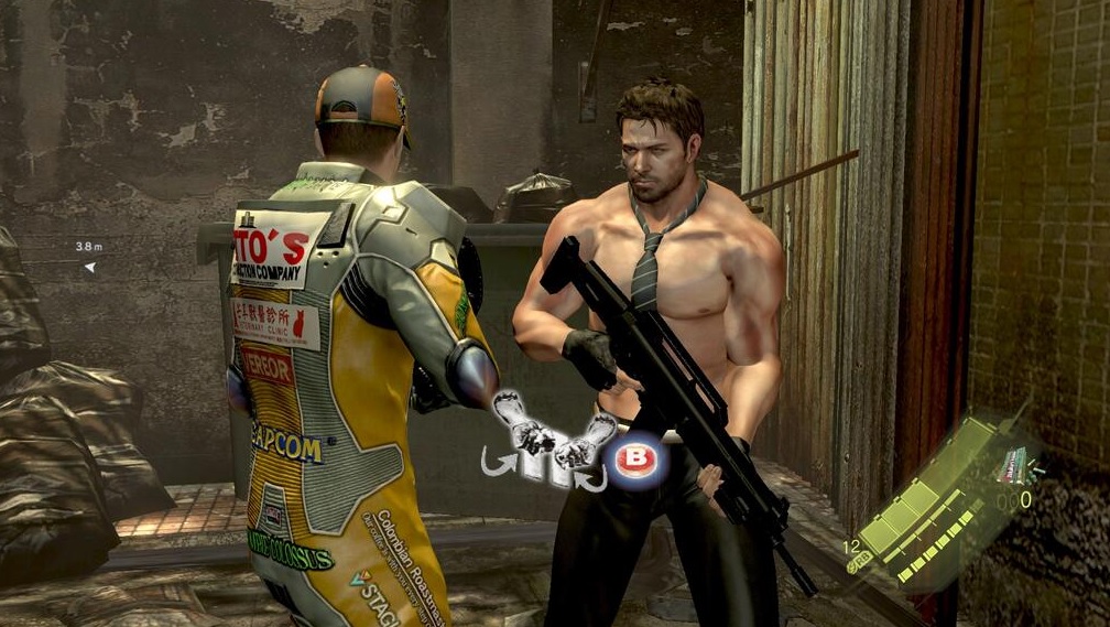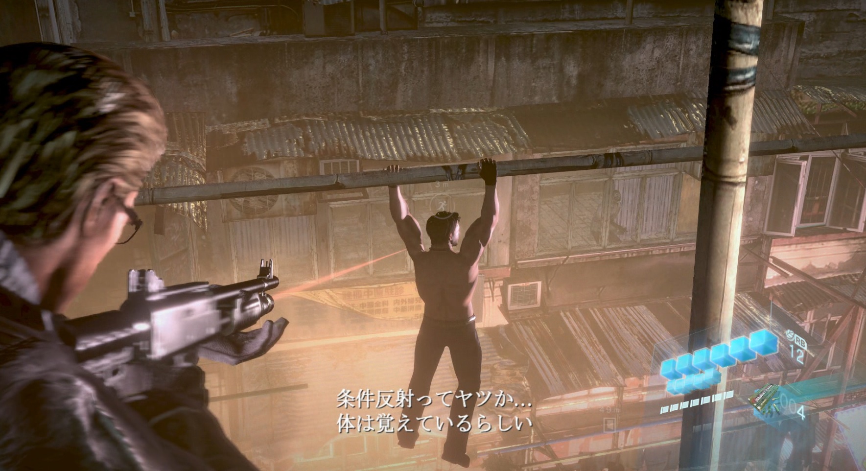 上半身裸でうんていするクリス(をスナイプするウェスカー