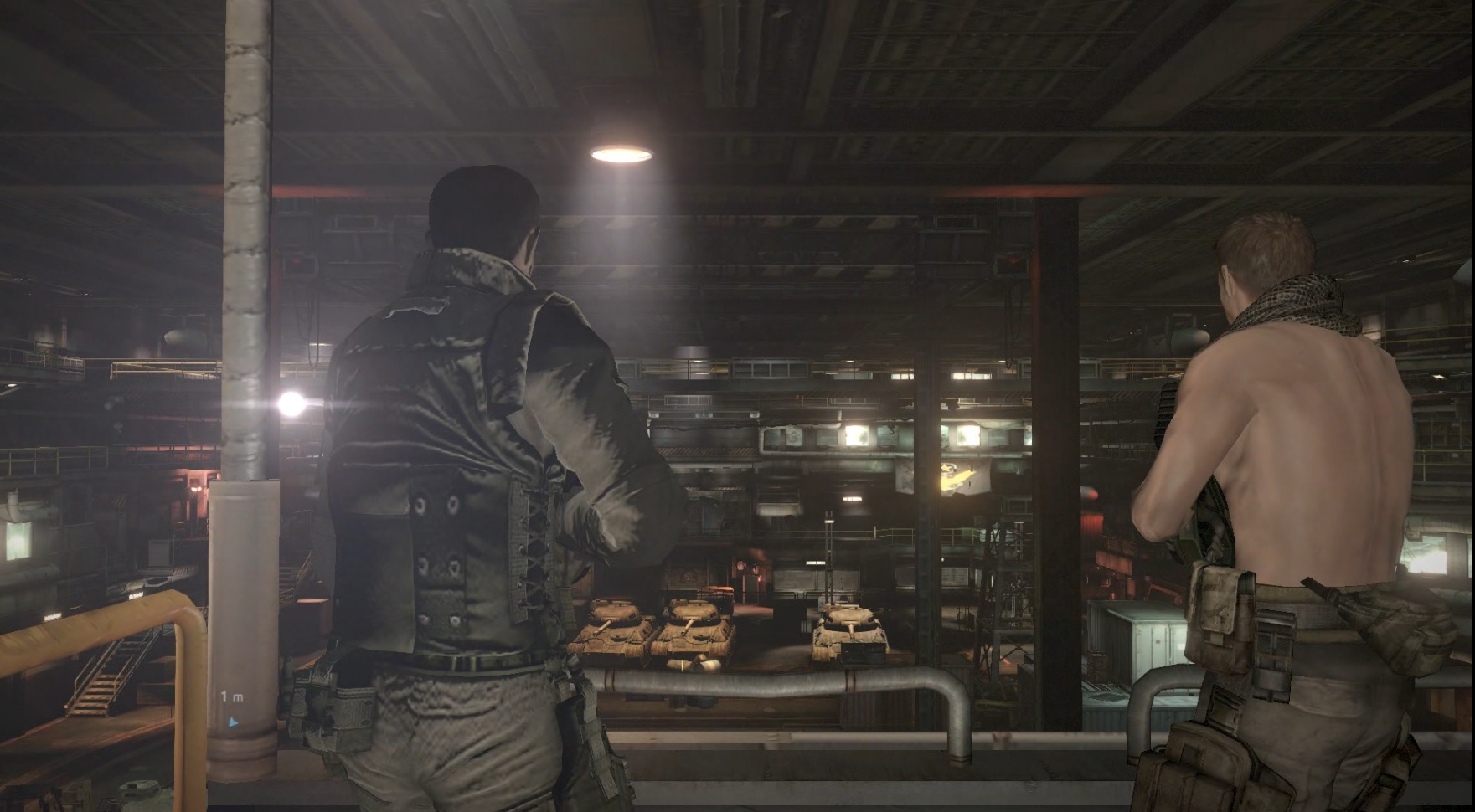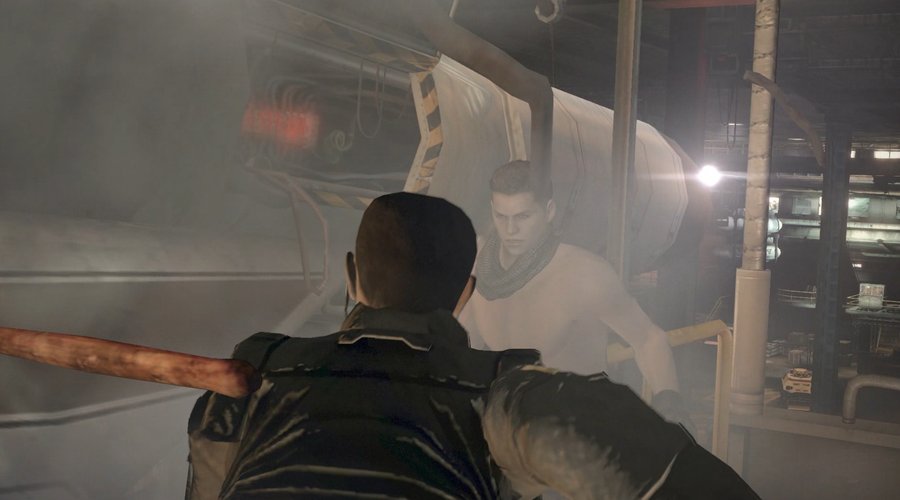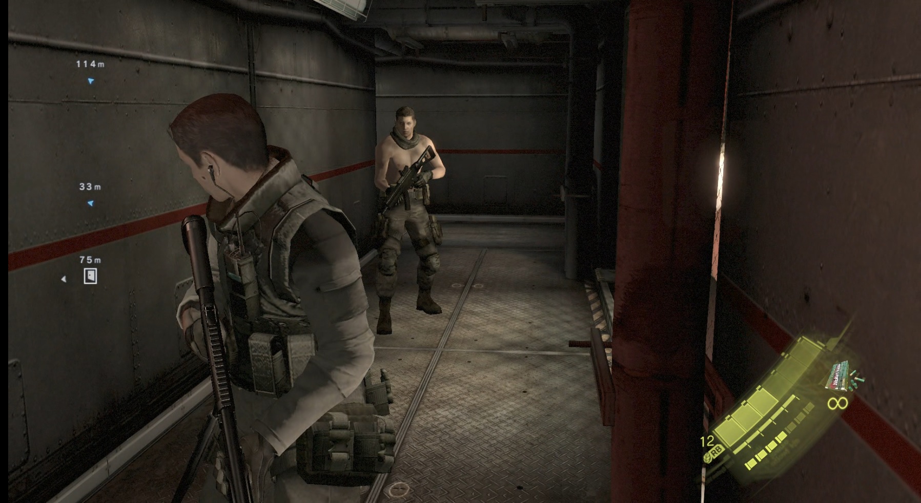上半身裸でうんていするクリス(をスナイプするウェスカー
